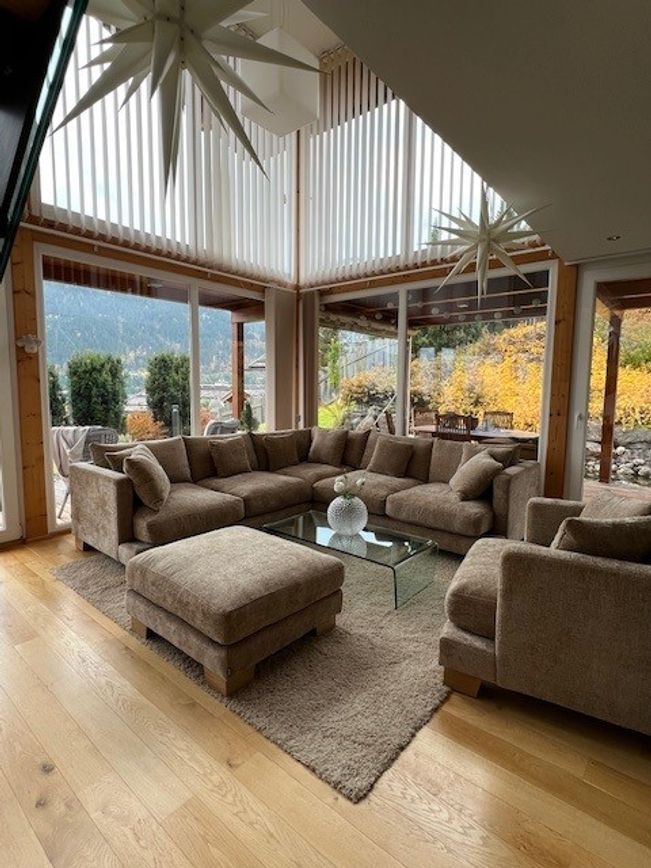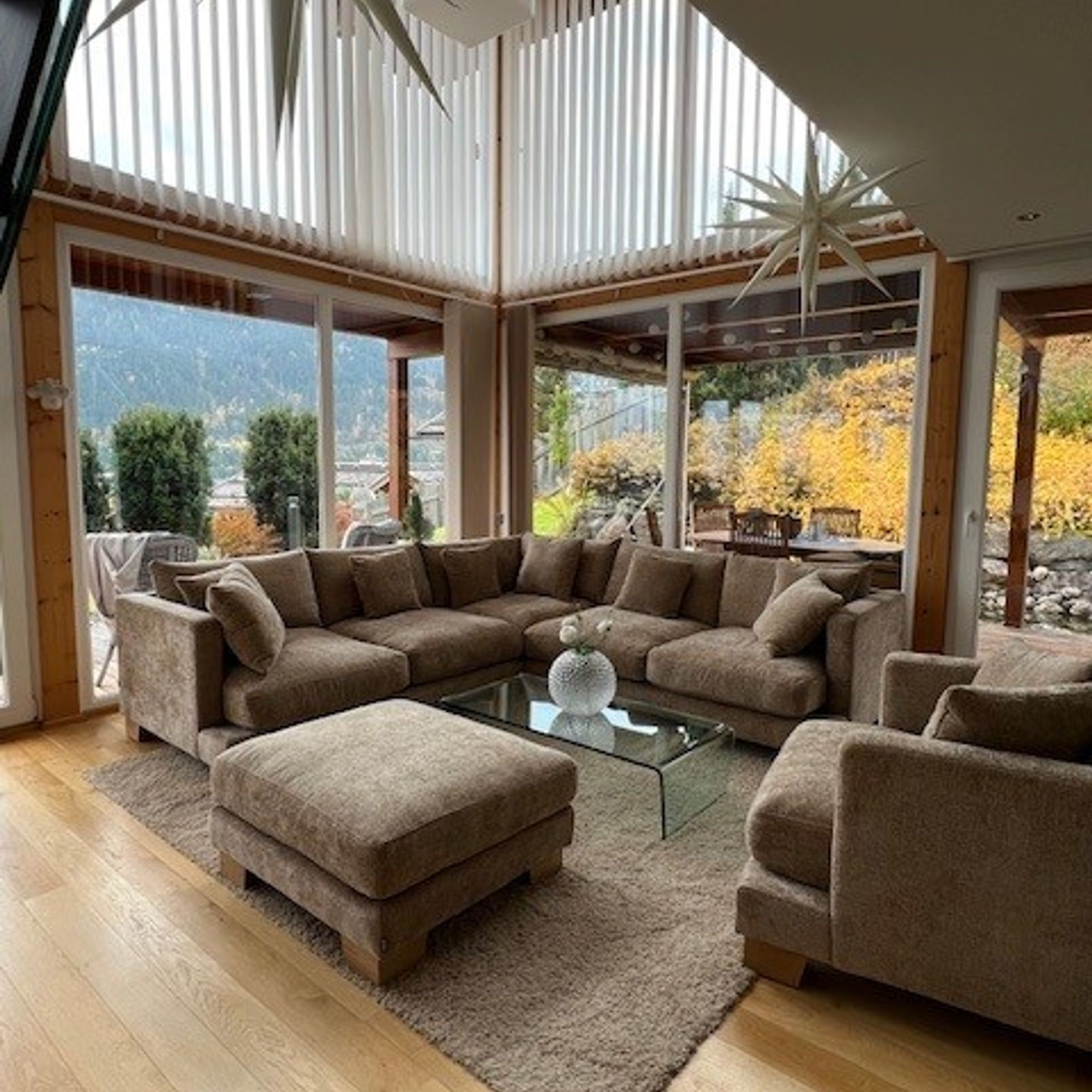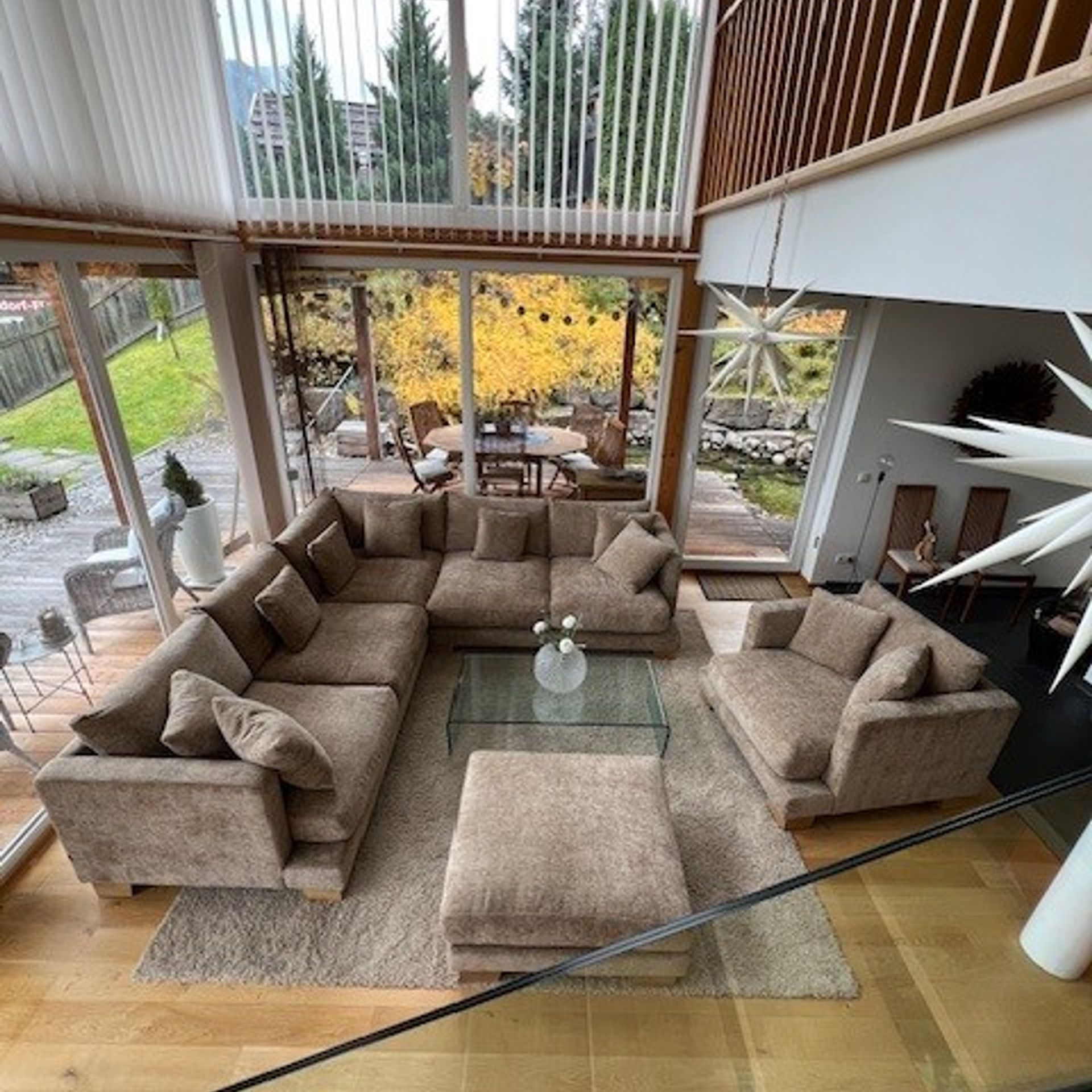 In diesem tollen Zuhause durften wir eine Einrichtung ergänzen, die Wärme, Eleganz und Geborgenheit perfekt vereint. Die großzügige Couchlandschaft im Teddy-Brown-Stoff lädt dazu ein, den Winter von seiner schönsten Seite zu genießen – weich, behaglich und mit ganz viel Platz fürs gemütliche Plaudern und Kuscheln. Ergänzt durch den passenden Hocker und den gemütlichen Sessel entsteht ein harmonisches Gesamtbild, das zum Verweilen einlädt.