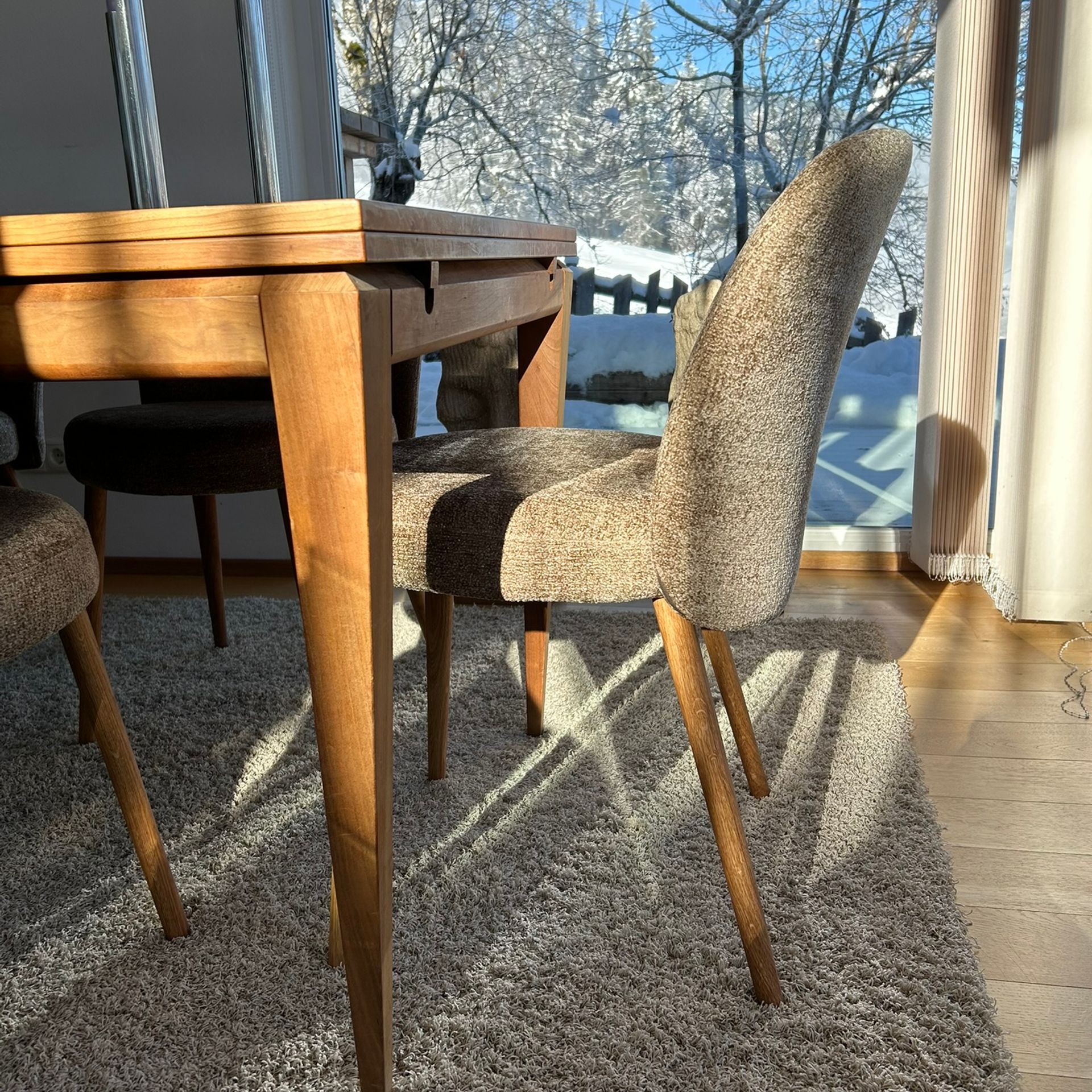 Der große sandfarbene Teppich rahmt den Wohnbereich gekonnt ein. Auch der Essbereich präsentiert sich in neuem Glanz: Die Stühle im gleichen Bezugstoff Teddy-Brown setzen ein stilvolles Statement.
