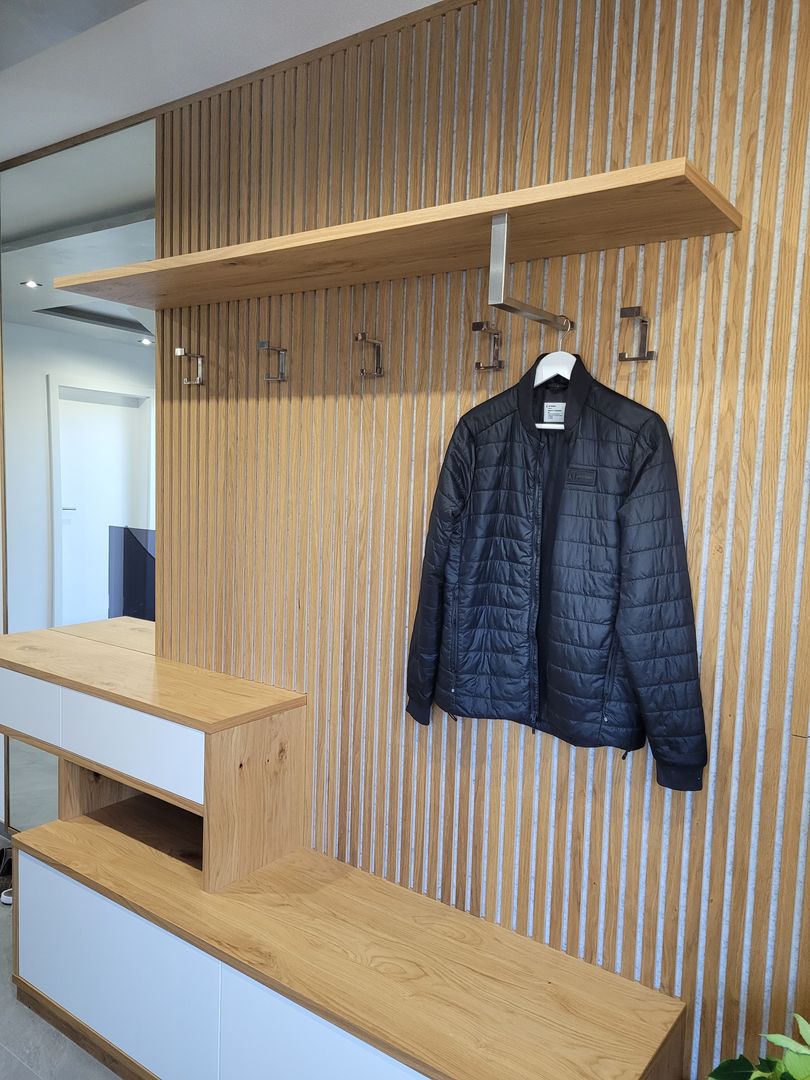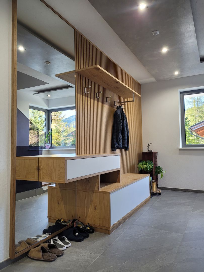Die Garderobe im 1. Stock kombiniert modernes Design mit hochwertigen Materialien und durchdachten Funktionen: