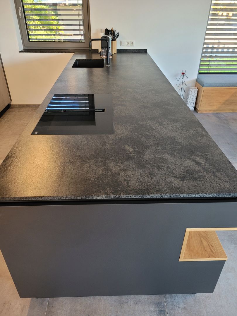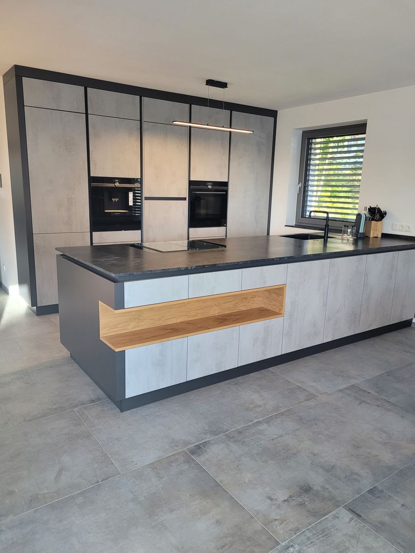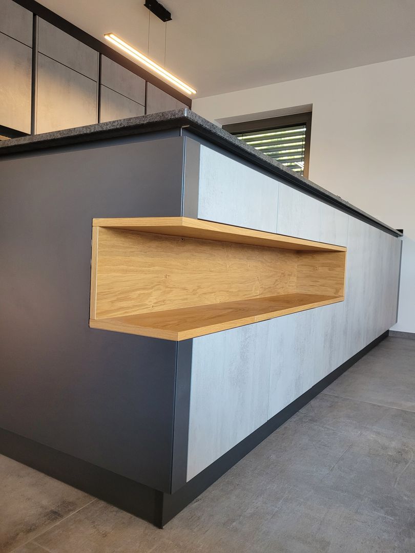 Küchenfront in Lavaschwarz trifft auf den natürlichen Charme der Wildeiche natur und Asteiche gebürstet – die perfekte Kombination aus modernem, edlem Design und natürlicher Wärme.