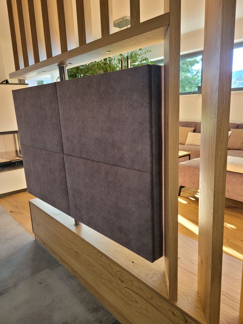 Ein absolutes Highlight: die freistehende TV-Wand mit Drehelement ermöglicht einen flexiblen Blickwinkel auf den Fernseher sowohl von der Couch als auch von der Küche und der dazugehörigen Essgruppe. Schöne eingearbeitet und integriert in schräg stehende Lamellen und dem TV-Möbel mit Auszugsladen für praktischen Stauraum.