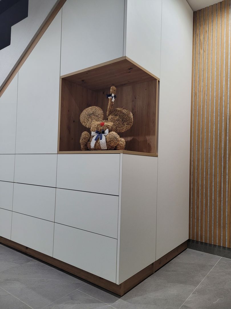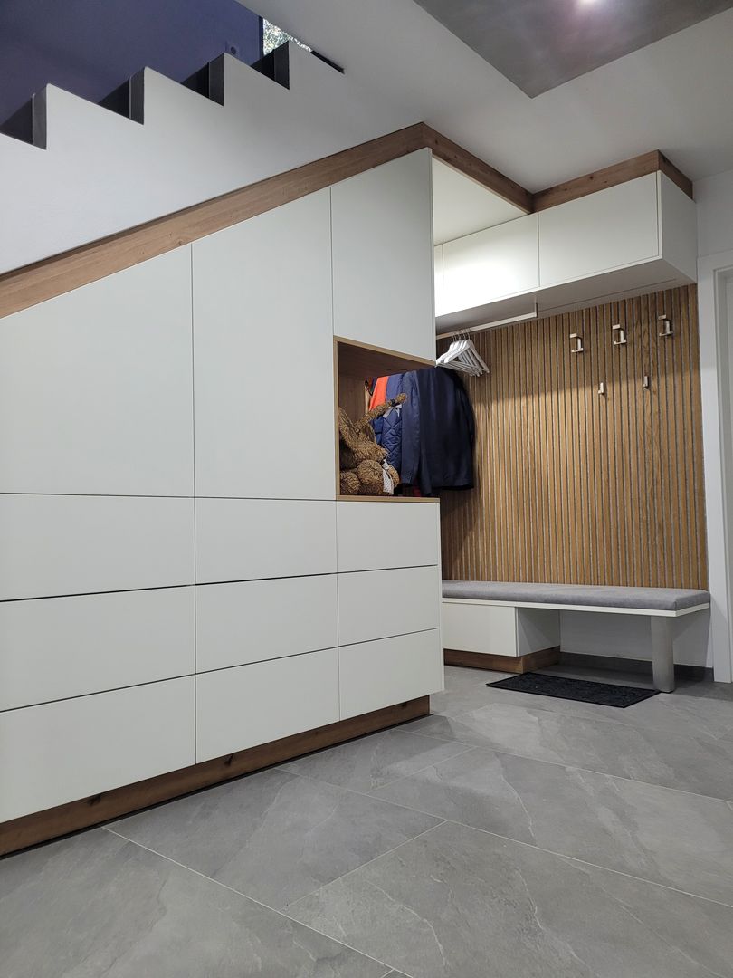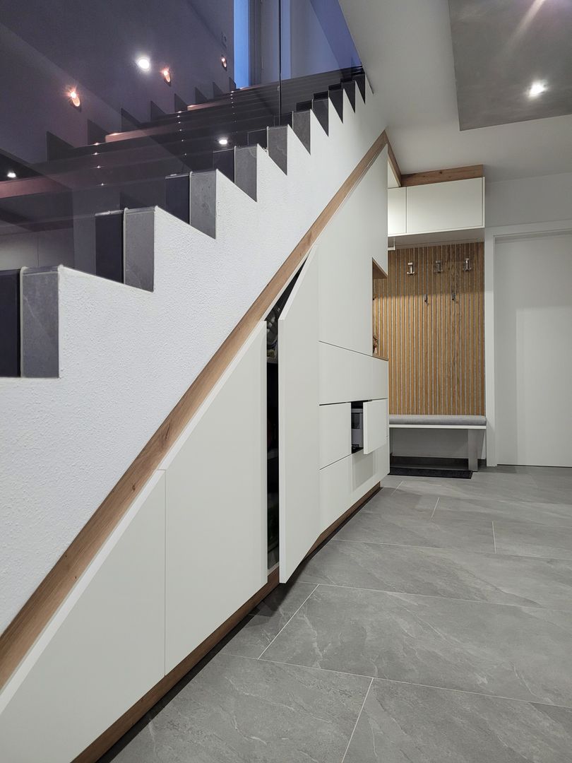 In dieser maßgeschneiderten Garderobe verschmilzt Funktionalität mit Design auf eindrucksvolle Weise. Sie integriert sich perfekt in den Treppenunterbau und nutzt jede noch so kleine Ecke optimal aus – mit cleveren Schubladen, Drehtüren und einer raffinierten, versteckten Tür. Ein echtes Stauraumwunder: der vollständig verbaute Treppenunterbau schafft nicht nur wertvollen Stauraum, sondern sorgt auch für eine harmonische Einheit. Das Zusammenspiel aus Glas, Dekor Weiß und Eiche sowie modernen Akustikpaneelen verleiht der Garderobe einen modernen und eleganten Look.