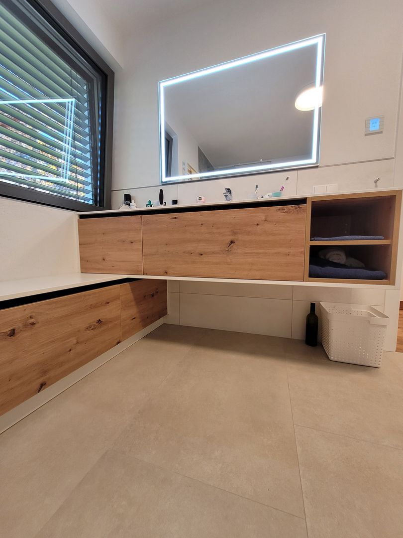Die Badmöbel durften wir in einer Kombination aus warmer Asteiche und einer edlen, weißen Corianplatte mit integriertem Waschbecken umsetzen. Dazu passend bieten die Schubladen mit eleganten Griffschalen eine handliche und dennoch stilvolle Lösung für den alltäglichen Bedarf. Sehr praktisch: die integrierte Sitzmöglichkeit, die wir stilvoll in das Möbeldesign eingebunden haben. Der vierseitig beleuchtete Spiegel sorgt für eine ideale Ausleuchtung und bringt zusätzlich eine angenehme Atmosphäre in das Badezimmer.