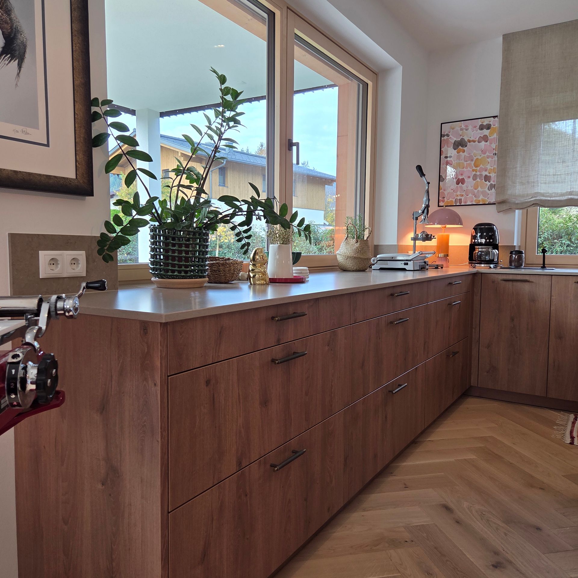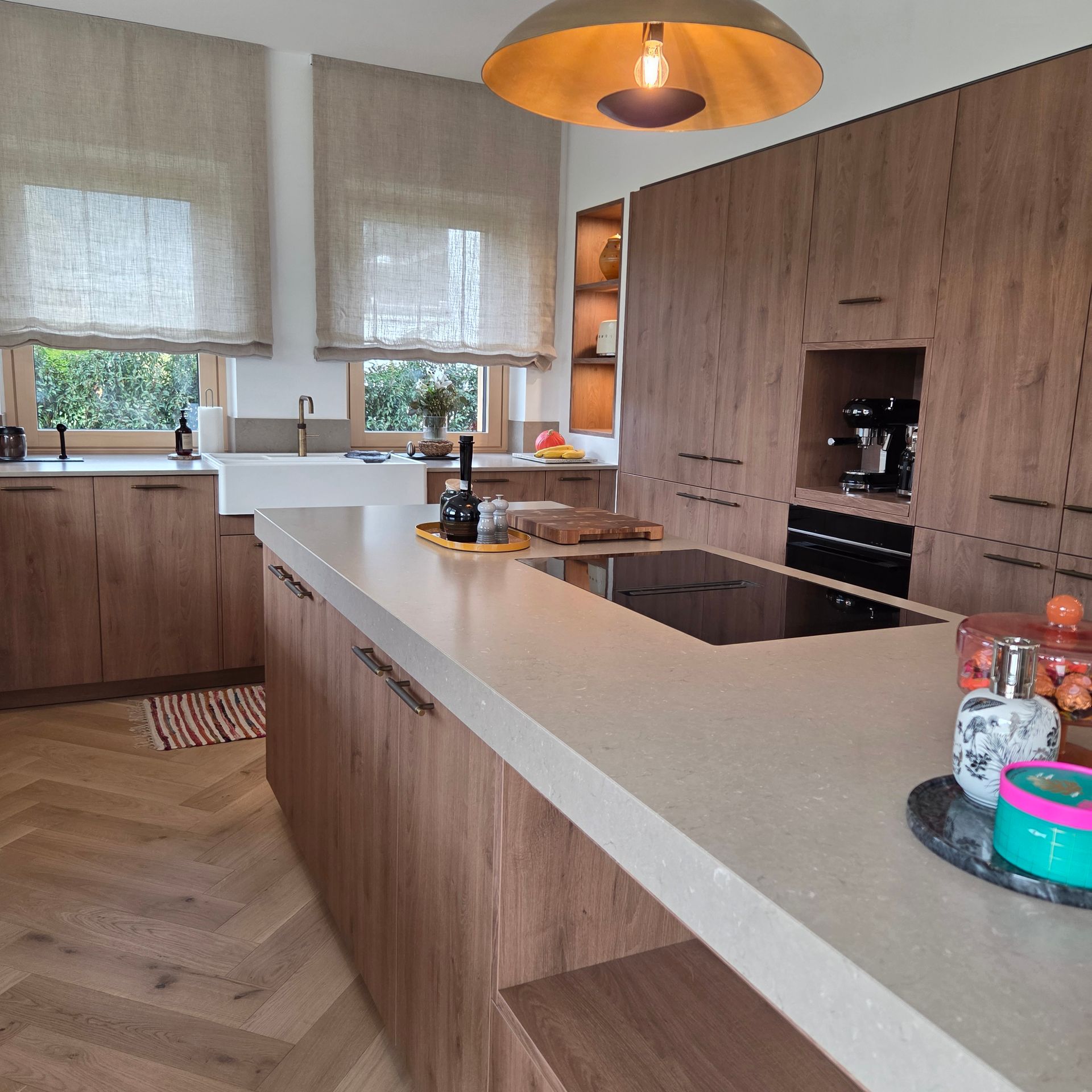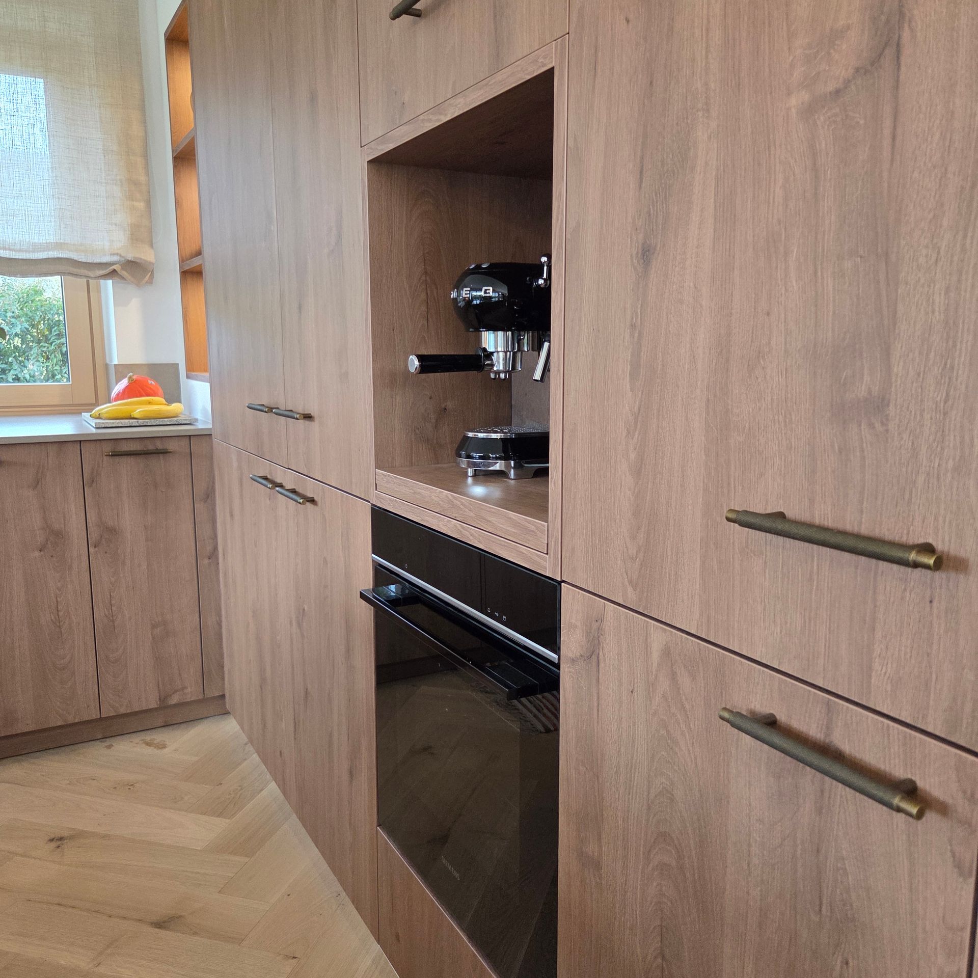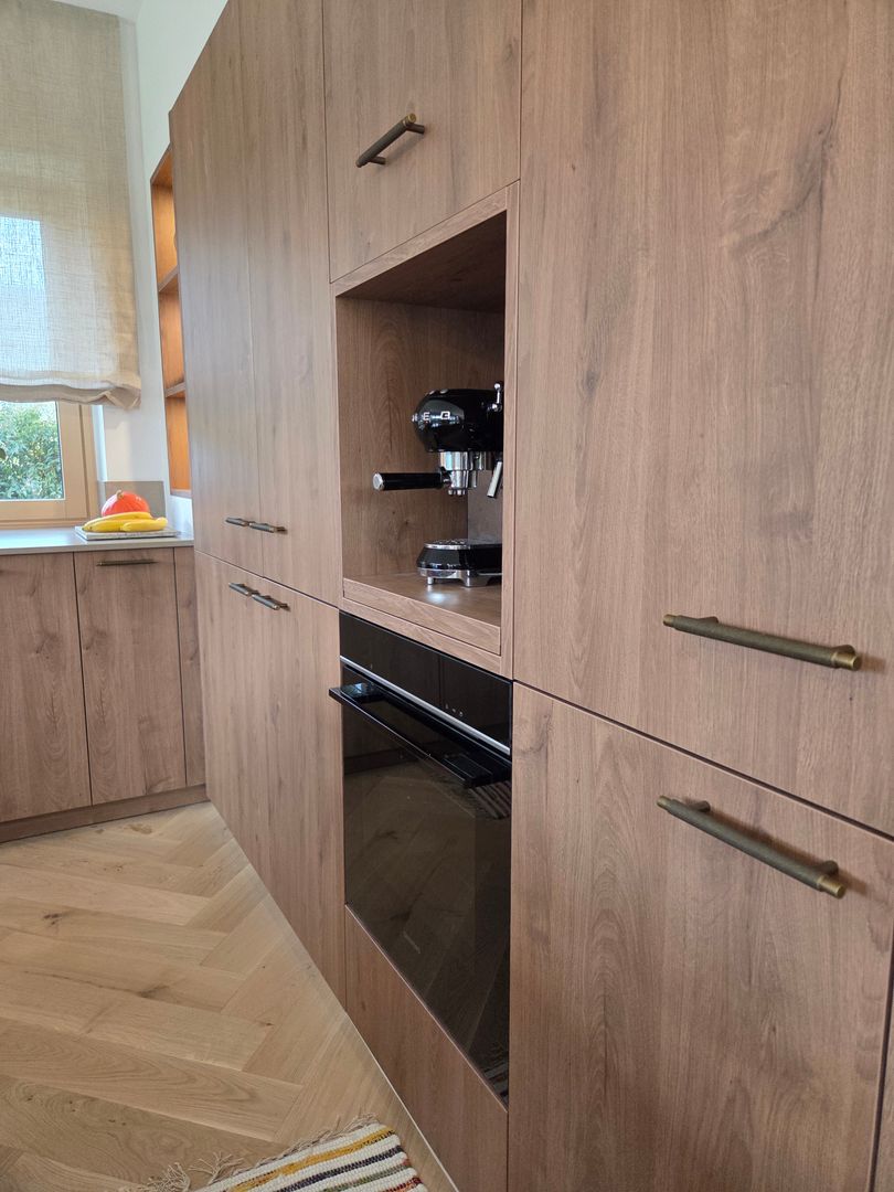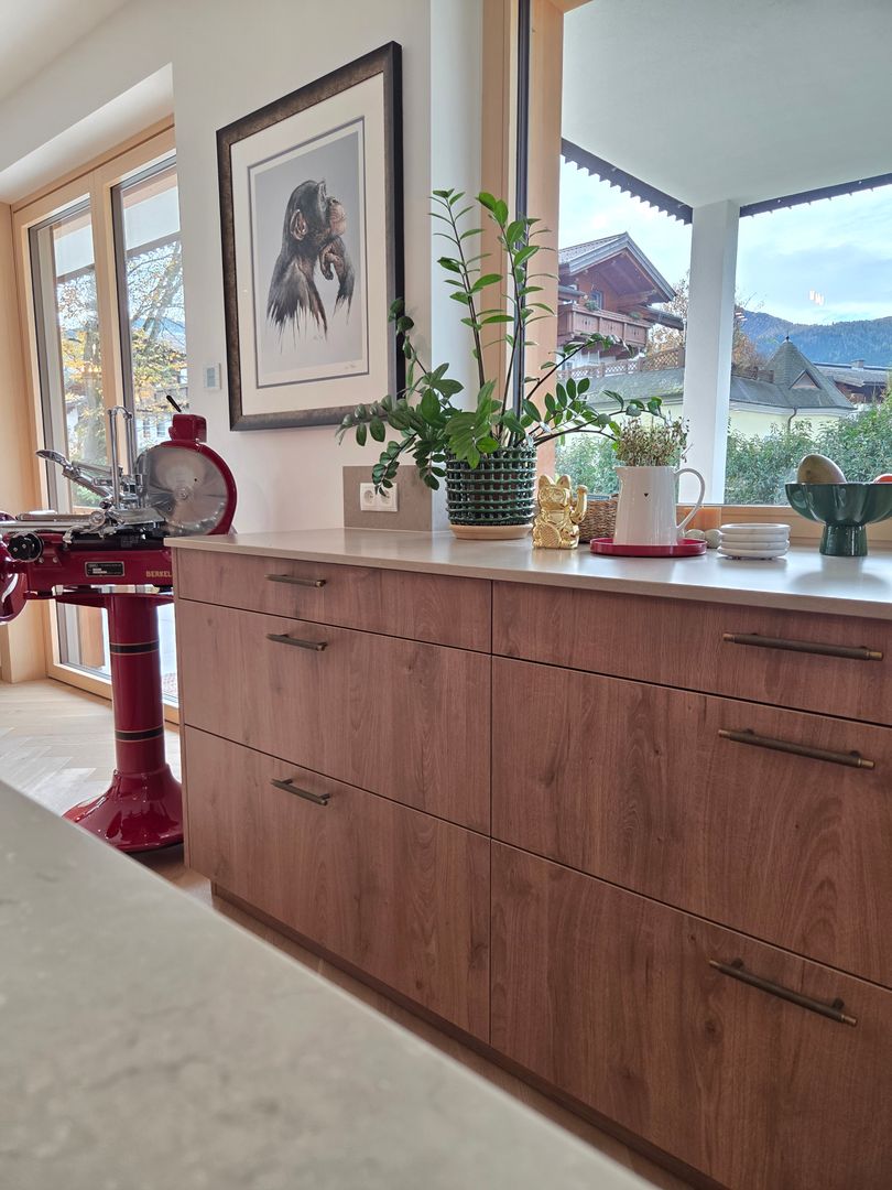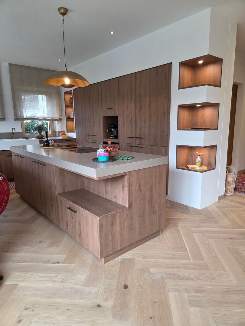 Die Kombination aus hochwertigem Holzdekor und der edlen Silestone-Arbeitsplatte schafft eine harmonische, zeitlose Optik. Besonders praktisch und stilvoll zugleich: die Kaffeenische mit Tablarauszug, die für Ordnung sorgt und zugleich zum Genuss einlädt.