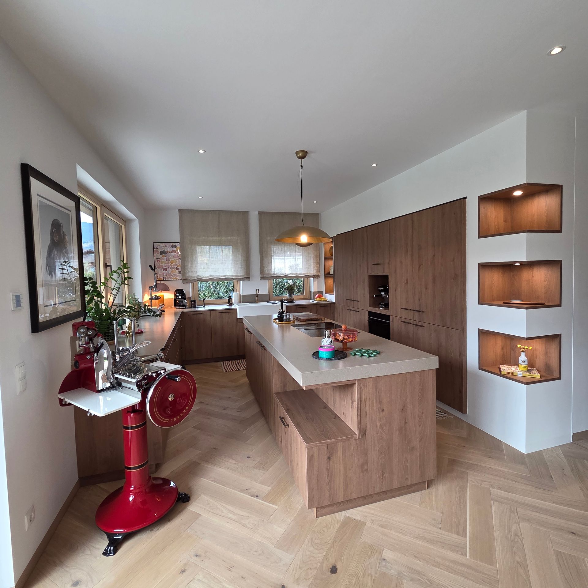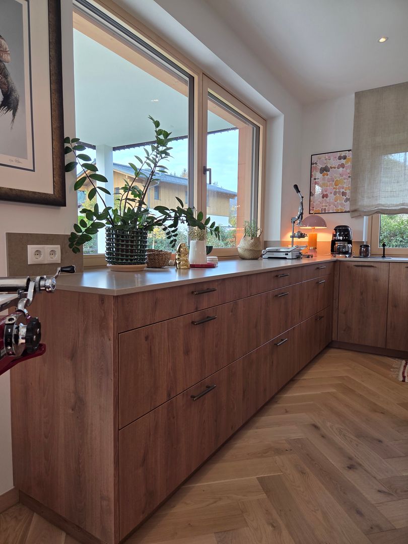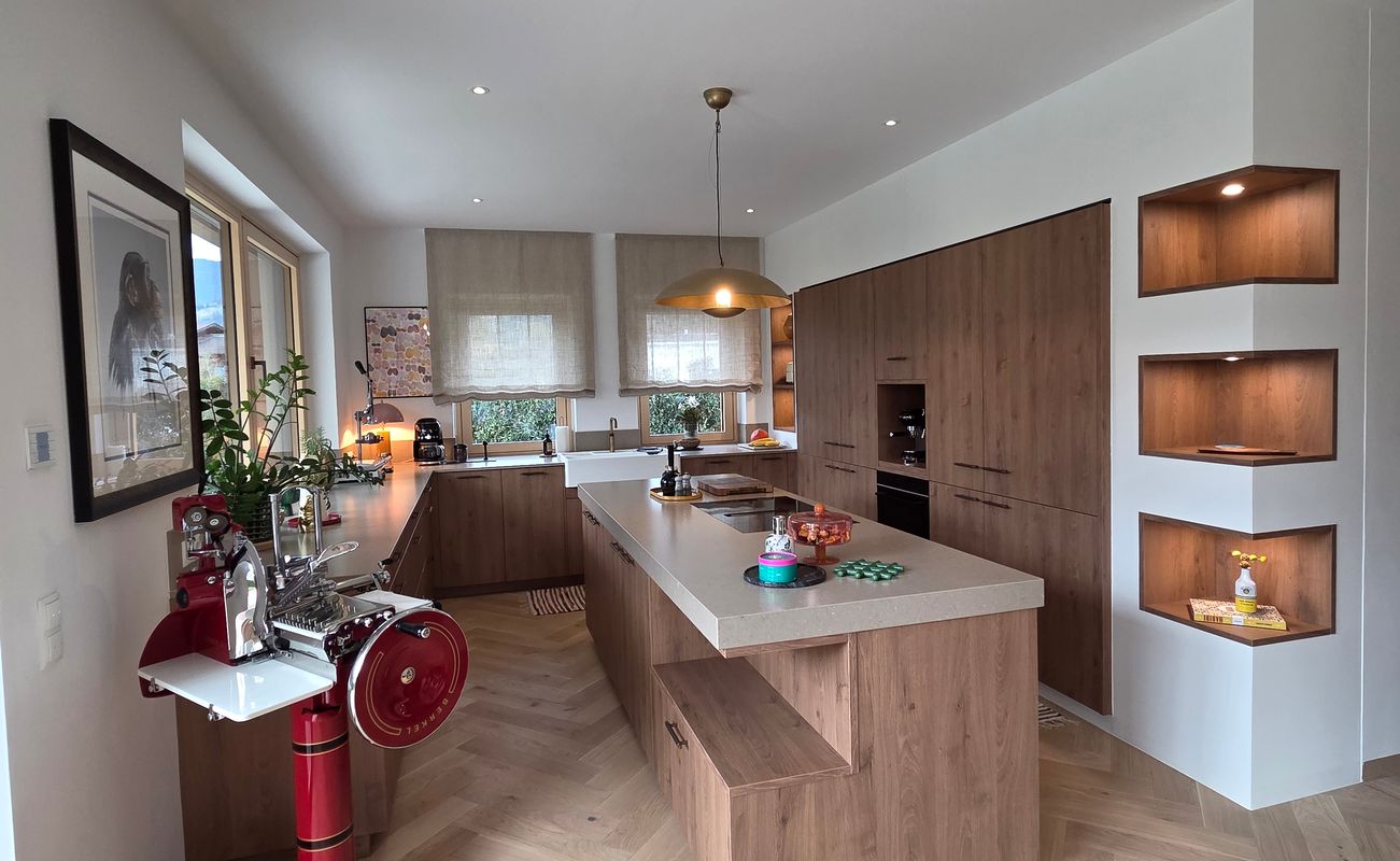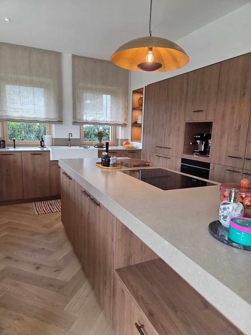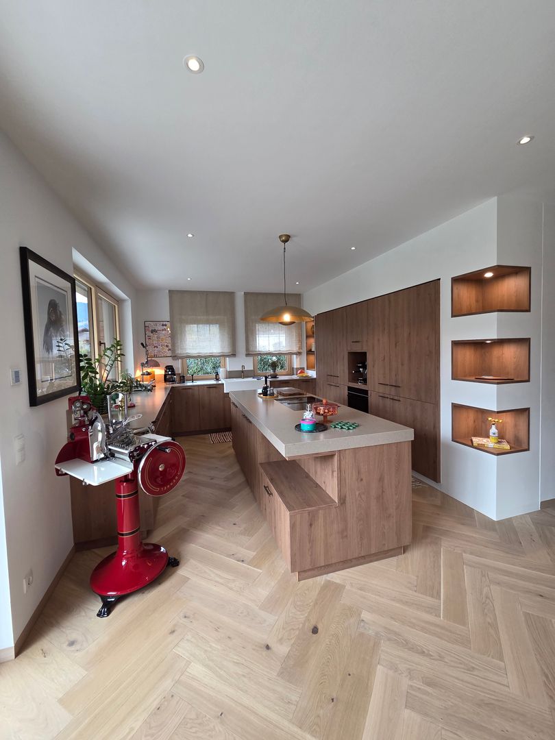 Diese großzügige, lichtdurchflutete Küche verbindet modernes Design mit warmen Naturmaterialien.