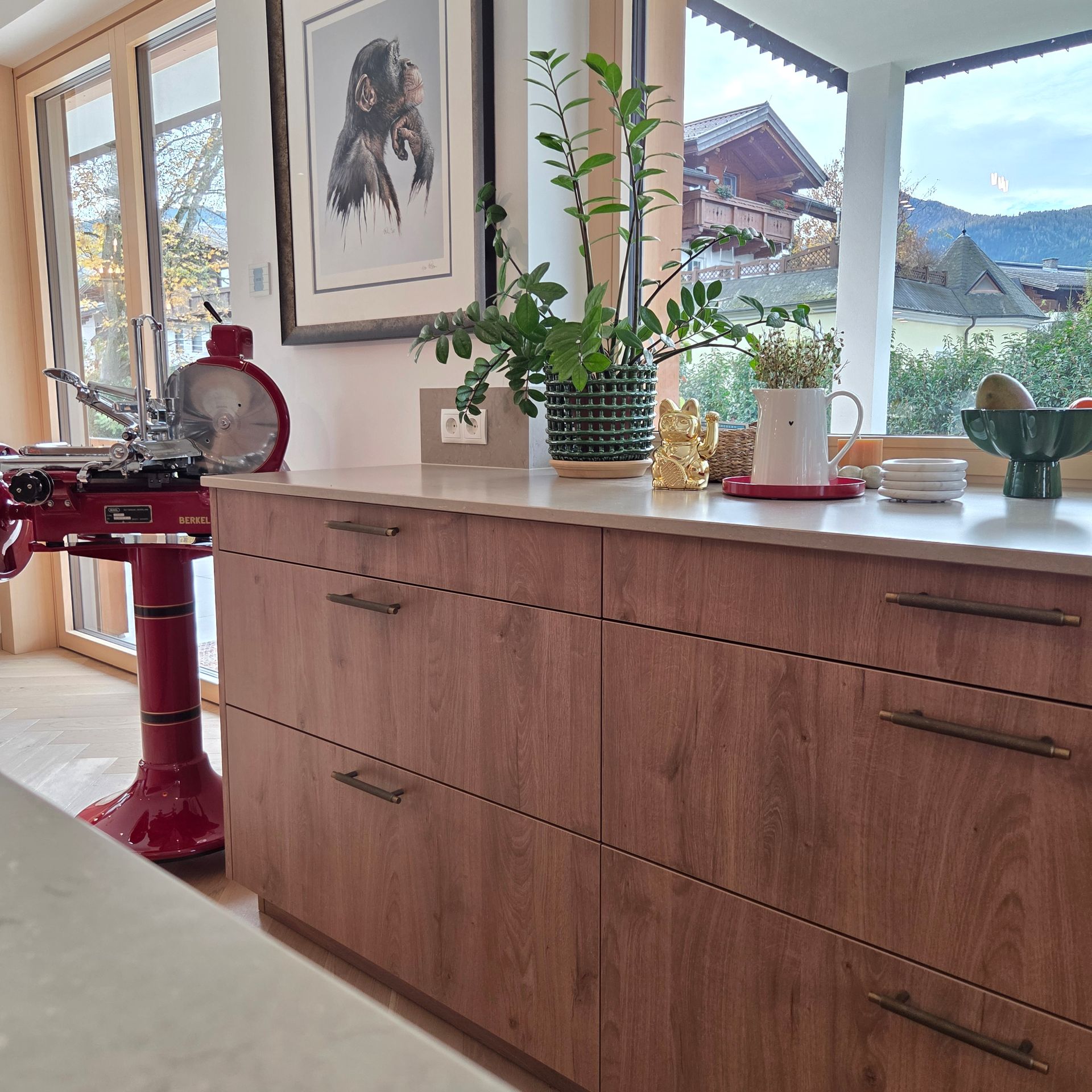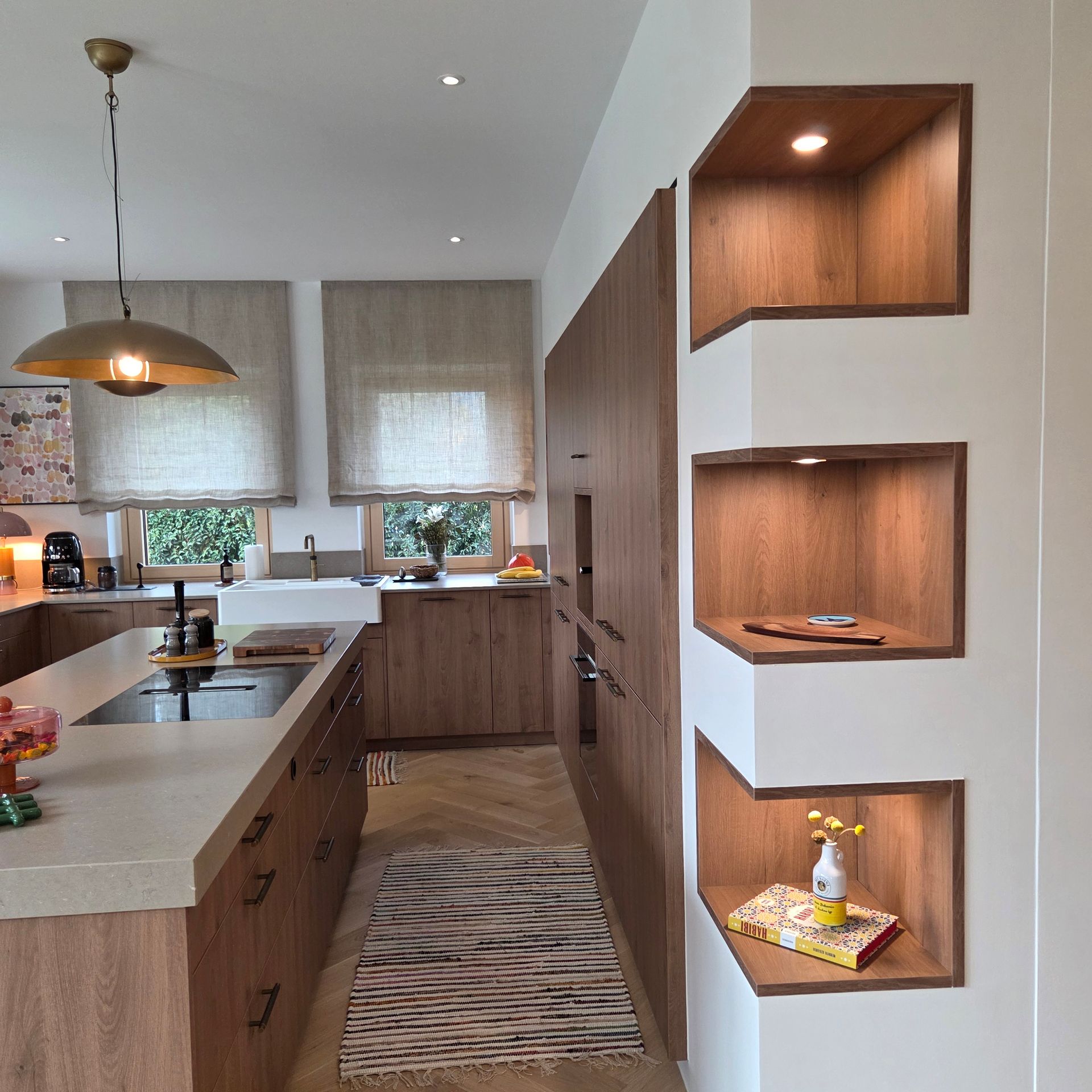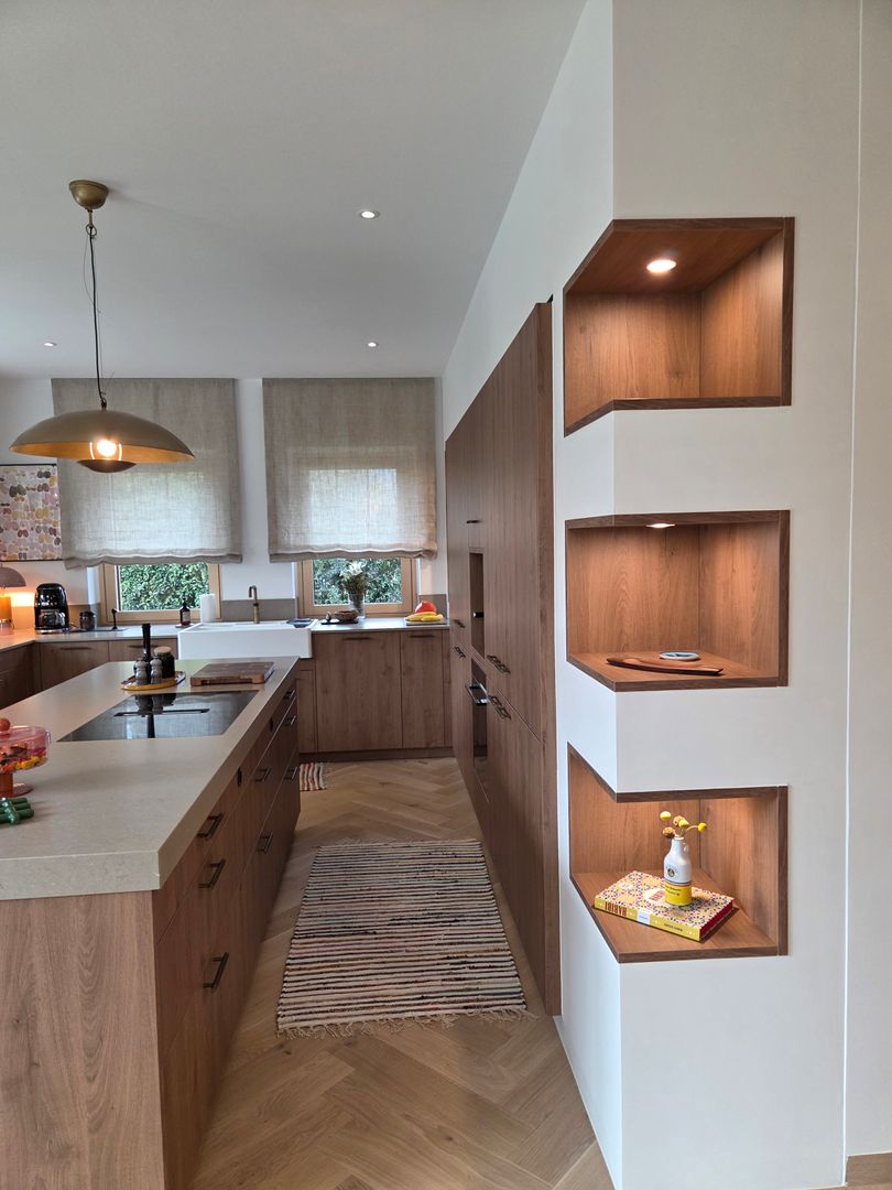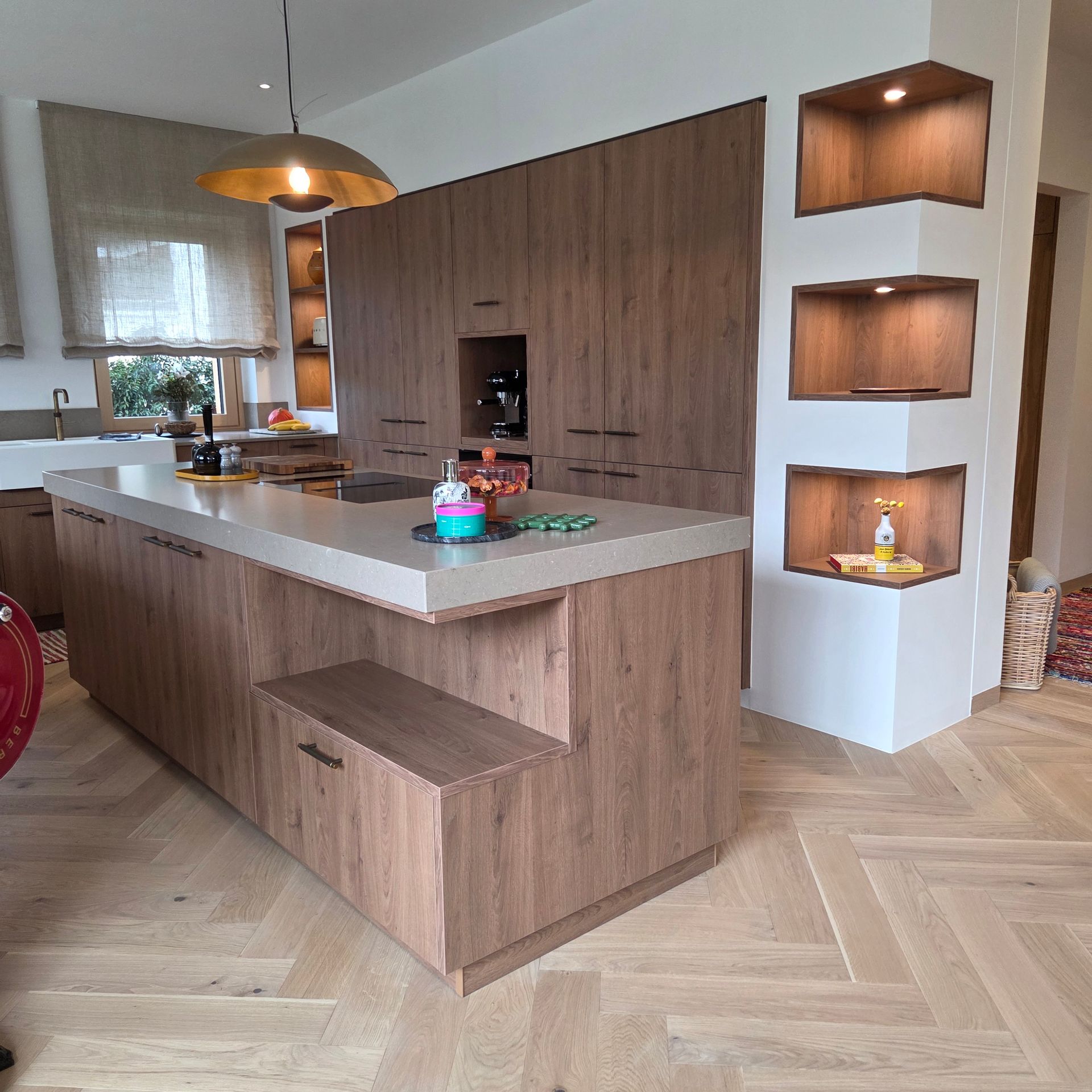 Diese großzügige, lichtdurchflutete Küche verbindet modernes Design mit warmen Naturmaterialien.