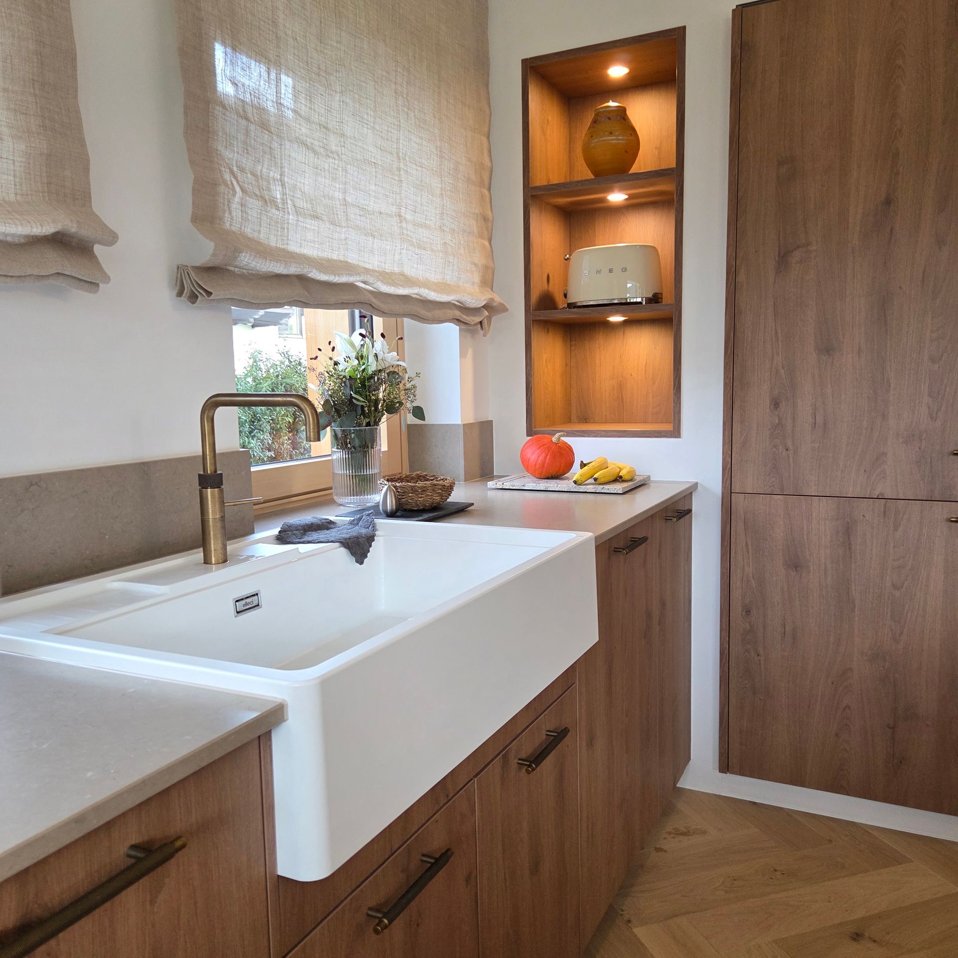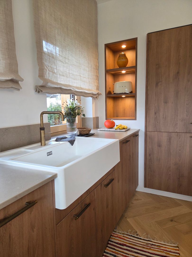 Der elegante VINTERA-Spülstein rundet das Gesamtbild ab und bringt einen Hauch Landhaus-Charme in die moderne Linienführung. Dazu viel Arbeitsfläche, durchdachte Stauraumlösungen und eine offene Gestaltung, die Kochen, Wohnen und Genießen verbindet.