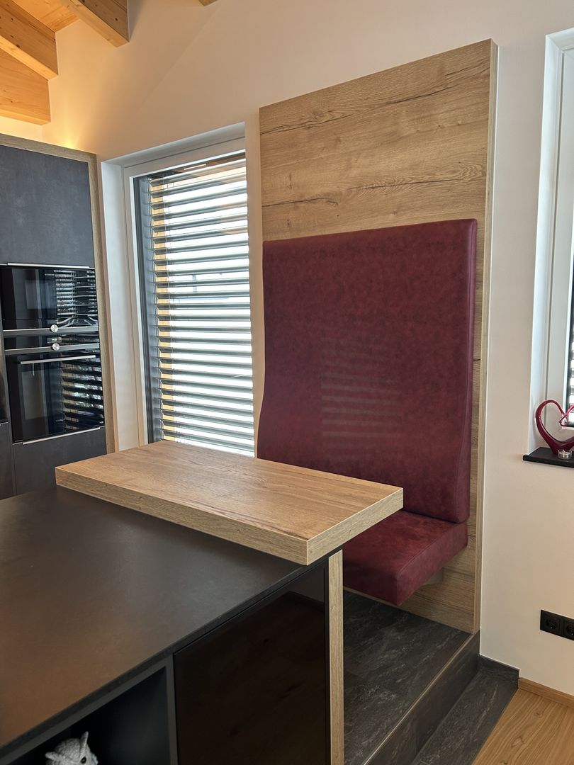 - Erhöhter Frühstücks- bzw. Barbereich mit frei hängender Barbank in schönem, weinroten Mikrofaserbezug als Kontrast und Blickfang