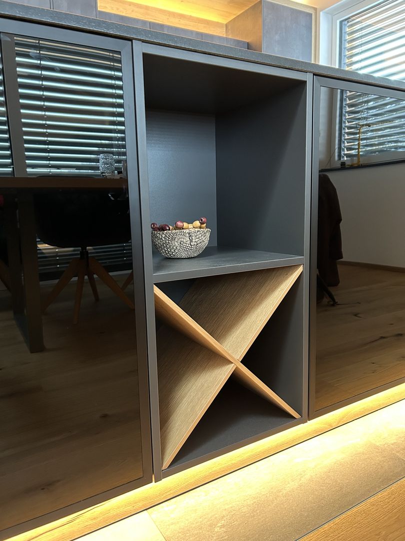 - Rückseite der Insel mit offenen Regalen, inkl. Kreuzteilung für Weinflaschen