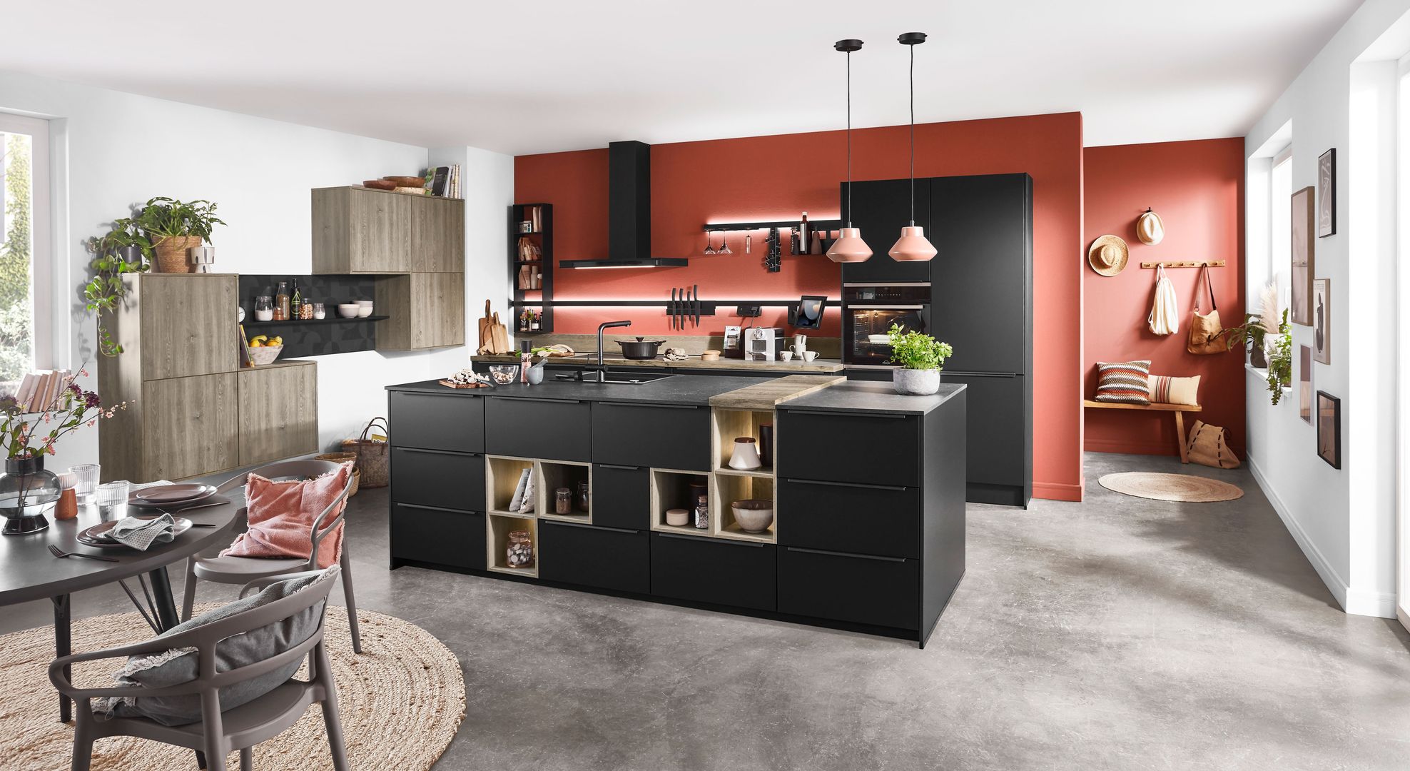 Wie sieht die Küche in den 2020-er Jahren aus? Eines ist klar: Sie ist offen für Neues. Offenes Wohnen ist so aktuell wie nie zuvor, und die einzelnen Lebensbereiche verschwimmen. In der Küche wird gearbeitet, gustiert und gekostet, auch gegessen, gechillt und verweilt. Das nicht mehr so wie vor einigen Jahren meist in klinischem Weiß, sondern in eher dunkleren Tönen. Dabei reicht der Bogen von Anthrazit über Mitternachtsblau und Tannengrün bis zu dunklen Hölzern, in die sich immer wieder ein neuer, leichter Rosé Ton mischt und für frischen Wind sorgt. Diese Farbwelt ist oft matt, in Anti-Fingerprint Optik, meist grifflos und mit vielen praktischen Details gespickt. Es gibt unzählige Varianten, um typische Küchenhelfer verschwinden zu lassen, die dann mit einem Handgriff sofort parat sind. Die Zeiten, in denen die Küche offensichtlich mit ihren technischen Hilfsmitteln geprahlt hat, sind Schnee von gestern. Alle Linien sind klar und puristisch. Die Küche beeindruckt als stylishes Designmöbel und Blickfang zugleich.